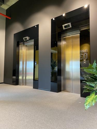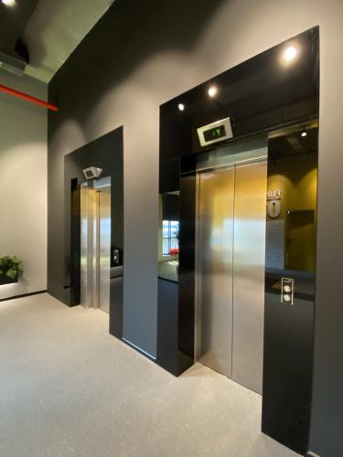 Mərtəbədəki lift girişlərinin kənarları xüsusi qara tripleks lamine şüşə ilə işlənmişdir. Lift şüşə kombinasiyası obyektin əsas girişi olan məkana əlavə həcm və görkəm qatır.
