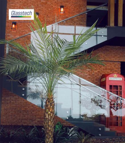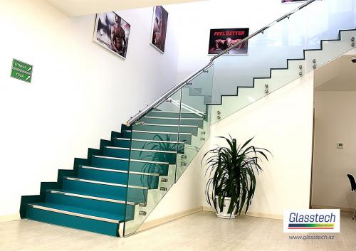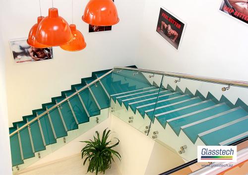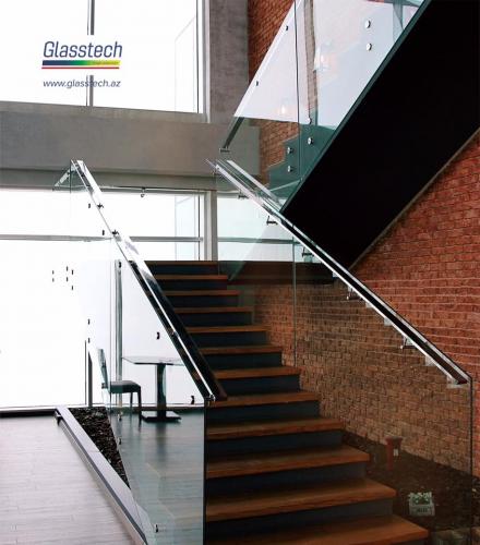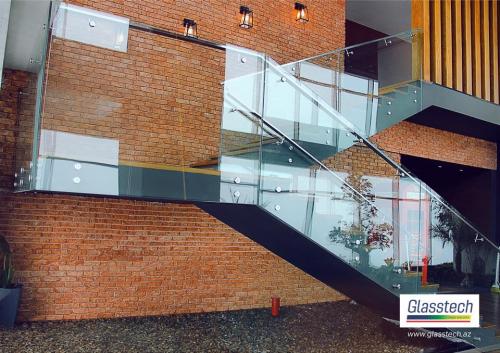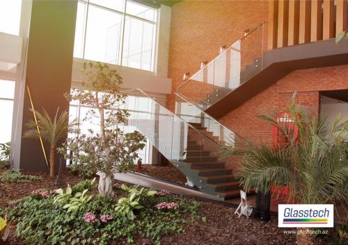 Glass railing is very widely used both in residential and public buildings. Such structures are in harmony with interior and visually increase the space. The difference of our company from others is that the laminated glass used to be installed to the balustrade is produced in our production using high-tech glass processing equipment. Our customers can order the installation of glass balustrade for stairs, balconies and roofs, shopping centers, etc. The installation of such glass structures along the slab allows us to save a significant value of space. Depending on the technical features of the project, we use various methods of fixing glass railings. We use the aluminum profile, point fixing parts in order to fix the glass to the concrete or any other structure.